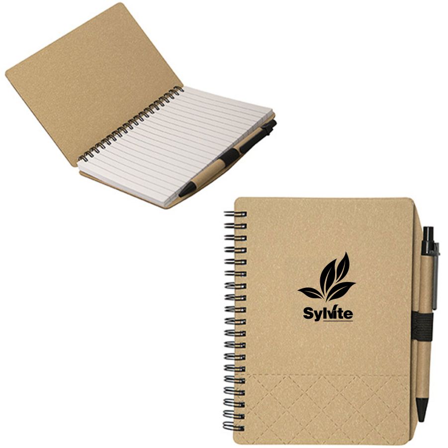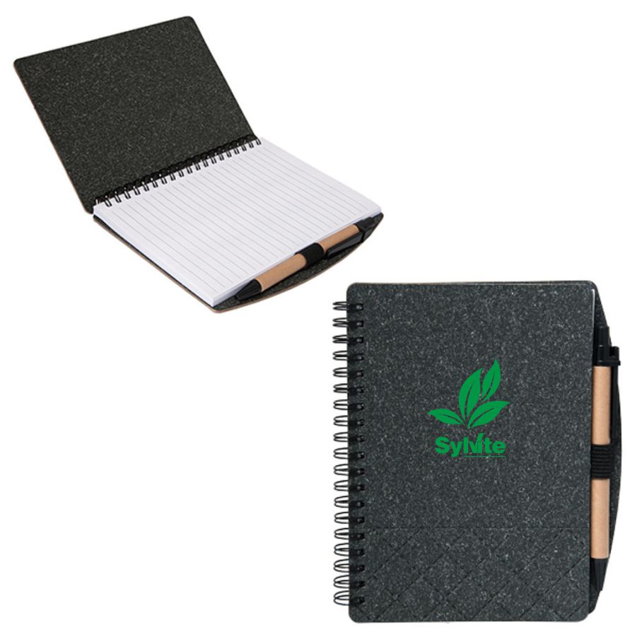 Cover has a speckled marble-like appearance Spiral binding Includes 70 sheets of lined 70 gram paper Elastic pen loop Includes Recycled Paper Pen, natural/black with blue ink Diamond quilted pattern along bottom third of the cover